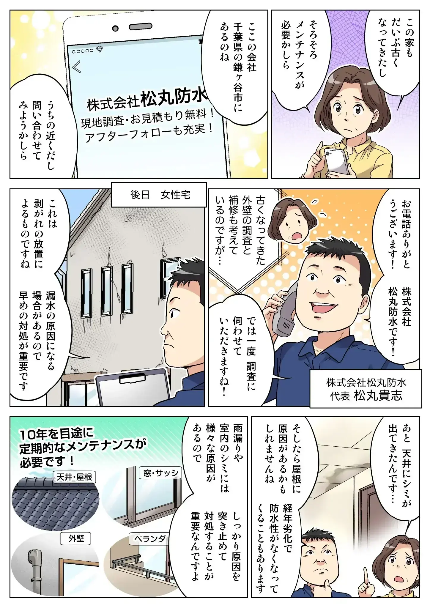 千葉県鎌ケ谷市の松丸防水では、経験豊富な職人たちがお客様の安全・安心な暮らしのため、豊富な実績と技術力を基に、建物の防水工事を専門に手がけております。お見積もりなど費用に関するご相談も承っておりますので、どうぞお気軽にお問い合わせください。